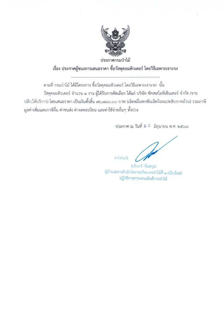 ประกาศกรมป่าไม้ เรื่อง ประกาศผู้ชนะการเสนอราคา ซื้อวัสดุคอมพิวเตอร์ โดยวิธีเฉพาะจง10 มิถุนายน 2025 ใน ประกาศผู้ชนะการเสนอราคา by adminir ประกาศกรมป่าไม้ เรื่อง ประกาศผู้ชนะการเสนอราคา ซื้อวัสดุคอมพิวเตอร์ โดยวิธีเฉพาะจง