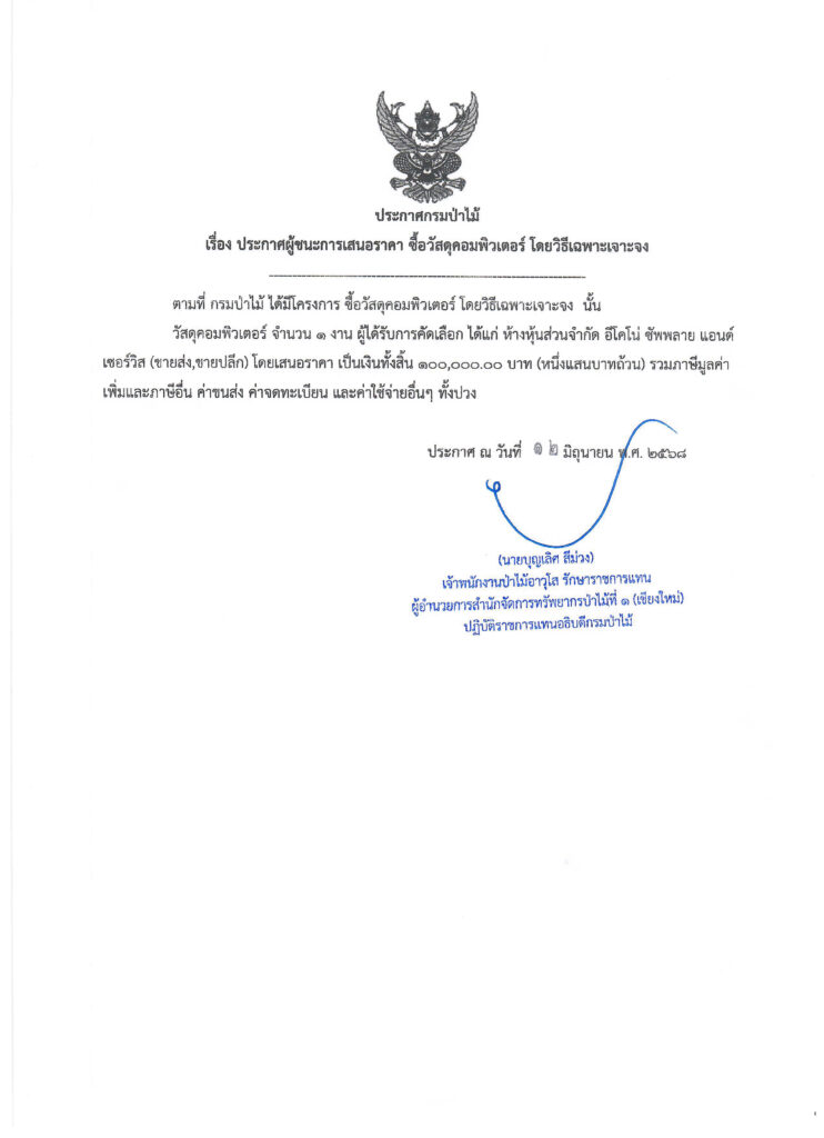ประกาศกรมป่าไม้ เรื่อง ประกาศผู้ชนะการเสนอราคา ซื้อวัสดุคอมพิวเตอร์ โดยวิธีเฉพาะเจาะจง12 มิถุนายน 2025 ใน ประกาศจัดซื้อจัดจ้าง / ประกาศผู้ชนะการเสนอราคา by adminir