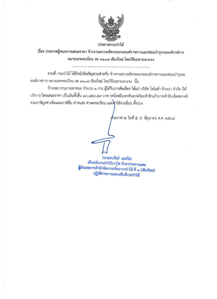 ประกาศกรมป่าไม้ เรื่อง ประกาศผู้ชนะการเสนอราคา จ้างงานตรวจเช็คระยะรถยนต์ราชการและซ่อมบำรุงรถยนต์ราชการหมายเลขทะเบียน งค ๙๑๐๗ เชียงใหม่ โดยวิธีเฉพาะเจาะจง13 มิถุนายน 2025 ใน ประกาศจัดซื้อจัดจ้าง / ประกาศผู้ชนะการเสนอราคา by adminir