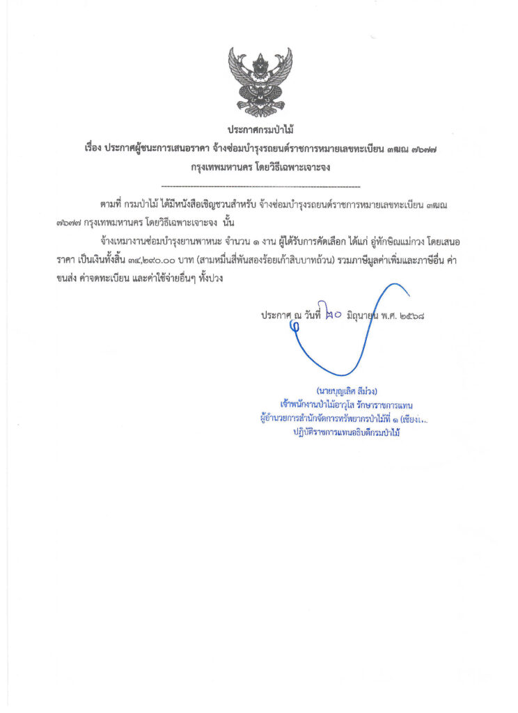 ประกาศกรมป่าไม้ เรื่อง ประกาศผู้ชนะการเสนอราคา จ้างซ่อมบำรุงรถยนต์ราชการหมายเลขทะเบียน ๓ฒณ ๗๖๗๗ กรุงเทพมหานคร โดยวิธีเฉพาะเจาะจง20 มิถุนายน 2025 ใน ประกาศจัดซื้อจัดจ้าง / ประกาศผู้ชนะการเสนอราคา by adminir