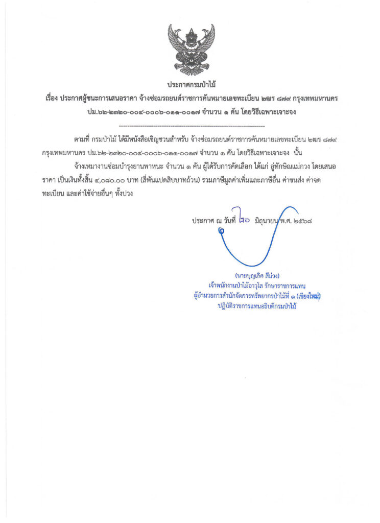 ประกาศกรมป่าไม้ เรื่อง ประกาศผู้ชนะการเสนอราคา จ้างซ่อมรถยนต์ราชการคันหมายเลขทะเบียน ๒ฒร ๘๗๙ กรุงเทพมหานคร ปม.๖๒-๒๓๒๐-๐๐๔-๐๐๐๖-๐๑๑-๐๐๑๗ จำนวน ๑ คัน โดยวิธีเฉพาะเจาะจง20 มิถุนายน 2025 ใน ประกาศจัดซื้อจัดจ้าง / ประกาศผู้ชนะการเสนอราคา by adminir
