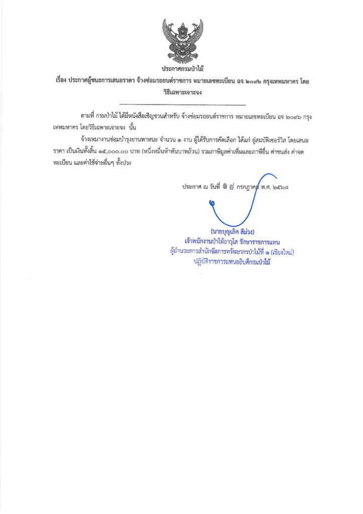 ประกาศกรมป่าไม้ เรื่อง ประกาศผู้ชนะการเสนอราคา จ้างซ่อมรถยนต์ราชการ หมายเลขทะเบียน ฉจ ๒๐๙๖ กรุงเทพมหาคร โดยวิธีเฉพาะเจาะจง17 กรกฎาคม 2025 ใน ประกาศจัดซื้อจัดจ้าง / ประกาศผู้ชนะการเสนอราคา by adminir