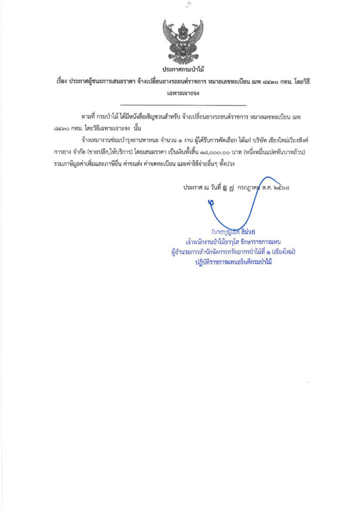 ประกาศกรมป่าไม้ เรื่อง ประกาศผู้ชนะการเสนอราคา จ้างเปลี่ยนยางรถยนต์ราชการ หมายเลขทะเบียน ฌพ ๘๔๓๐ กหม. โดยวิธีเฉพาะเจาะจง17 กรกฎาคม 2025 ใน ประกาศจัดซื้อจัดจ้าง / ประกาศผู้ชนะการเสนอราคา by adminir