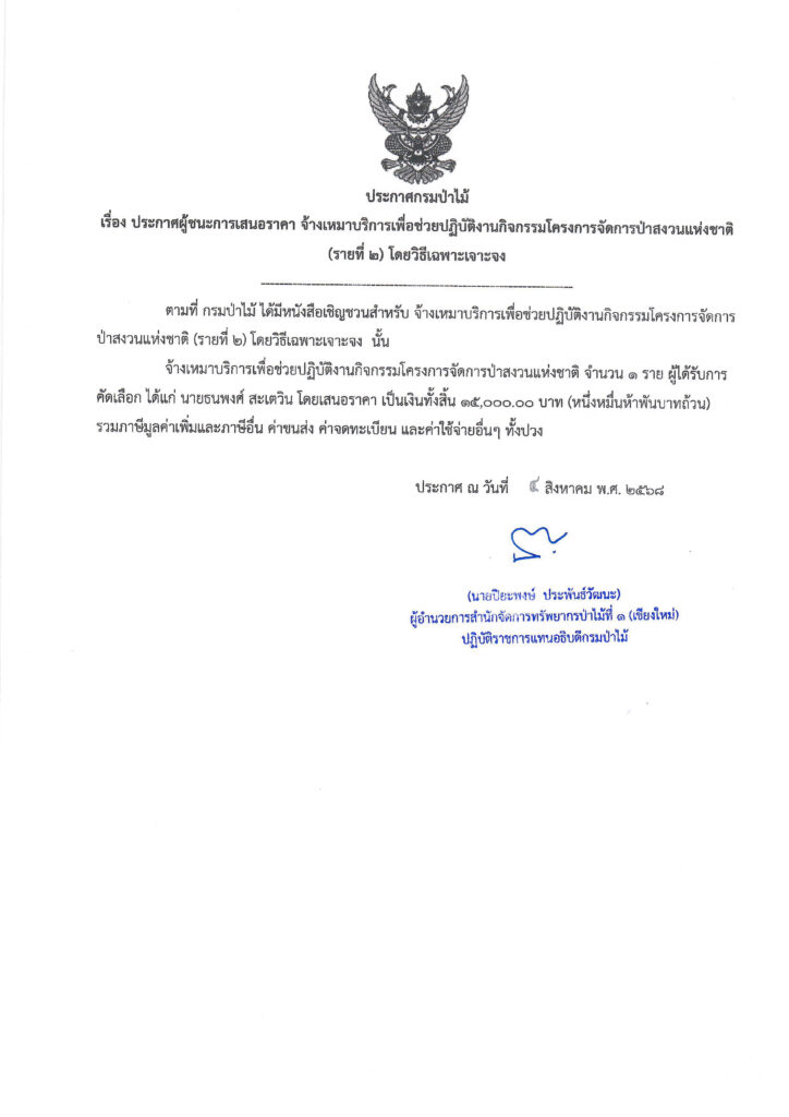 ประกาศกรมป่าไม้ เรื่อง ประกาศผู้ชนะการเสนอราคา จ้างเหมาบริการเพื่อช่วยปฏิบัติงานกิจกรรมโครงการจัดการป่าสงวนแห่งชาติ (รายที่ ๒) โดยวิธีเฉพาะเจาะจง4 สิงหาคม 2025 ใน ประกาศจัดซื้อจัดจ้าง / ประกาศผู้ชนะการเสนอราคา by adminir