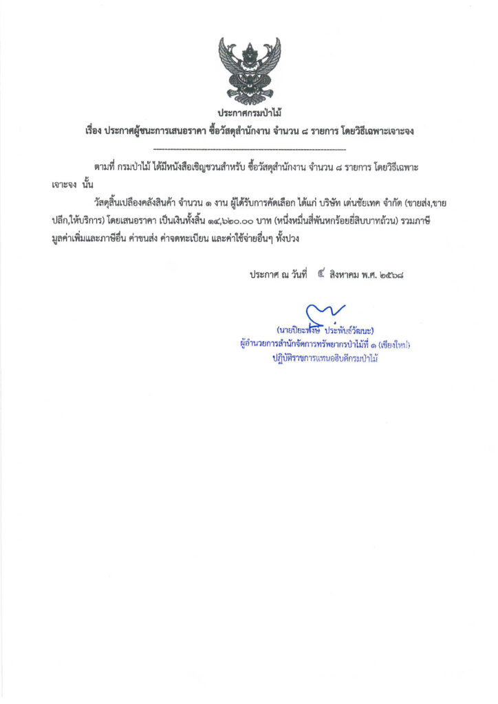 ประกาศกรมป่าไม้ เรื่อง ประกาศผู้ชนะการเสนอราคา ซื้อวัสดุสำนักงาน จำนวน ๘ รายการ โดยวิธีเฉพาะเจาะจง4 สิงหาคม 2025 ใน ประกาศจัดซื้อจัดจ้าง / ประกาศผู้ชนะการเสนอราคา by adminir