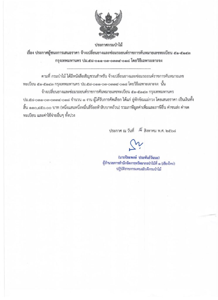ประกาศกรมป่าไม้ เรื่อง ประกาศผู้ชนะการเสนอราคา จ้างเปลี่ยนยางและซ่อมรถยนต์ราชการคันหมายเลขทะเบียน ๕๑-๕๑๔๓ กรุงเทพมหานคร ปม.๕๘-๐๑๑-๐๓-๐๓๓๔-๐๑๘ โดยวิธีเฉพาะเจาะจง