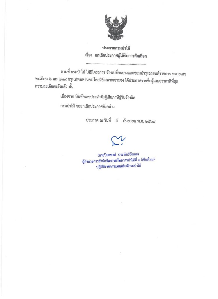 ประกาศกรมป่าไม้ เรื่อง ยกเลิกประกาศผู้ได้รับการคัดเลือก10 กันยายน 2025 ใน ประกาศจัดซื้อจัดจ้าง / ประกาศผู้ชนะการเสนอราคา by adminir