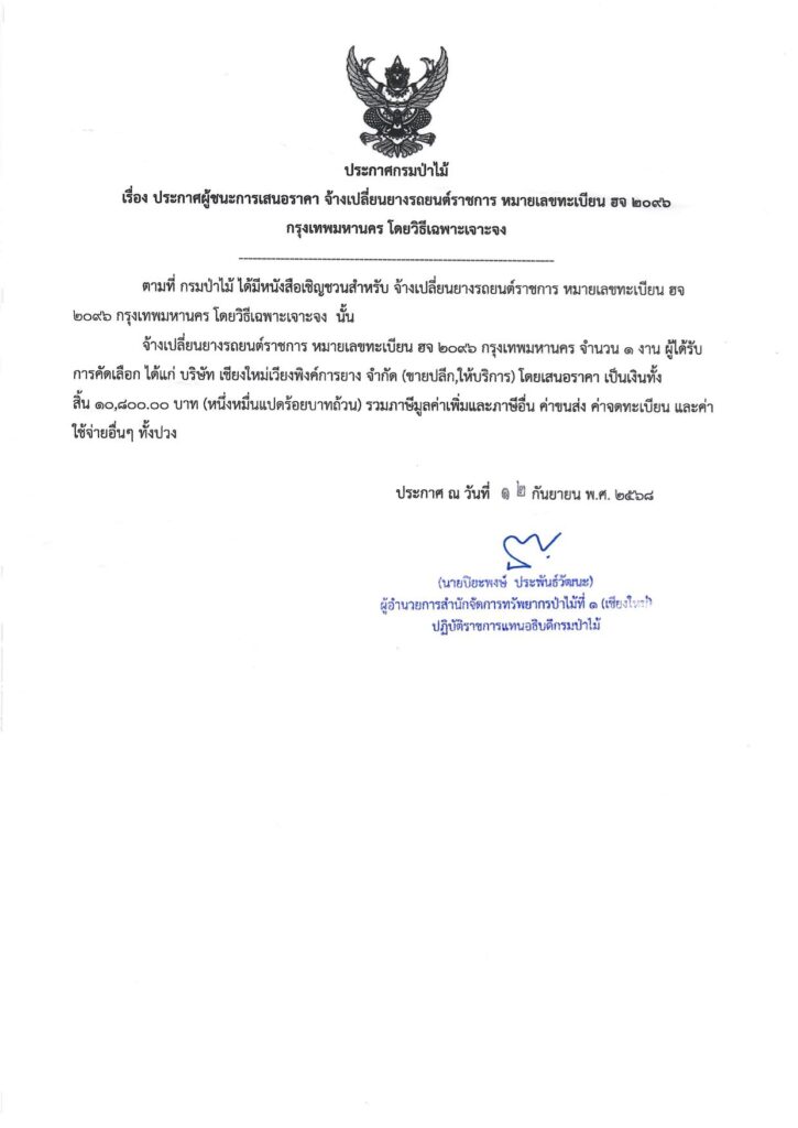 ประกาศกรมป่าไม้ เรื่อง ประกาศผู้ชนะการเสนอราคา จ้างเปลี่ยนยางรถยนต์ราชการ หมายเลขทะเบียน ฮจ ๒๐๙๖ กรุงเทพมหานคร โดยวิธีเฉพาะเจาะจง