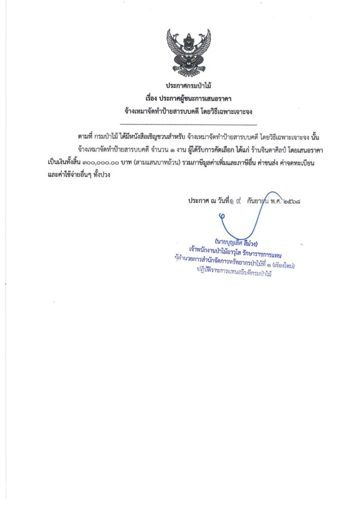 ประกาศกรมป่าไม้ เรื่อง ประกาศผู้ชนะเสนอราคา จ้างเหมาจัดทำป้ายสารบบคดี โดยวิธีเฉพาะเจาะจง19 กันยายน 2025 ใน ประกาศจัดซื้อจัดจ้าง / ประกาศผู้ชนะการเสนอราคา by adminir