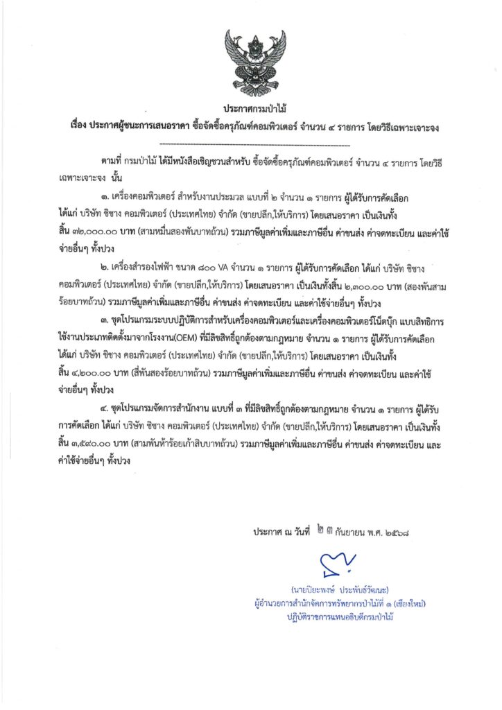 ประกาศกรมป่าไม้ เรื่อง ประกาศผู้ชนะการเสนอราคา ซื้อจัดซื้อครุภัณฑ์คอมพิวเตอร์ จำนวน ๔ รายการ โดยวิธีเฉพาะเจาะจง24 กันยายน 2025 ใน ประกาศจัดซื้อจัดจ้าง / ประกาศผู้ชนะการเสนอราคา by adminir