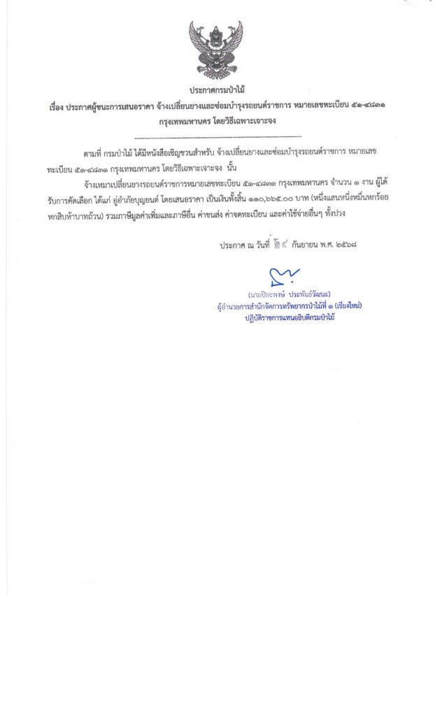 ประกาศกรมป่าไม้ เรื่อง ประกาศผู้ชนะการเสนอราคา จ้างเปลี่ยนยางและซ่อมบำรุงรถยนต์ราชการ หมายเลขทะเบียน ๕๑-๔๘๓๑ กรุงเทพมหานคร โดยวิธีเฉพาะเจาะจง25 กันยายน 2025 ใน ประกาศจัดซื้อจัดจ้าง / ประกาศผู้ชนะการเสนอราคา by adminir