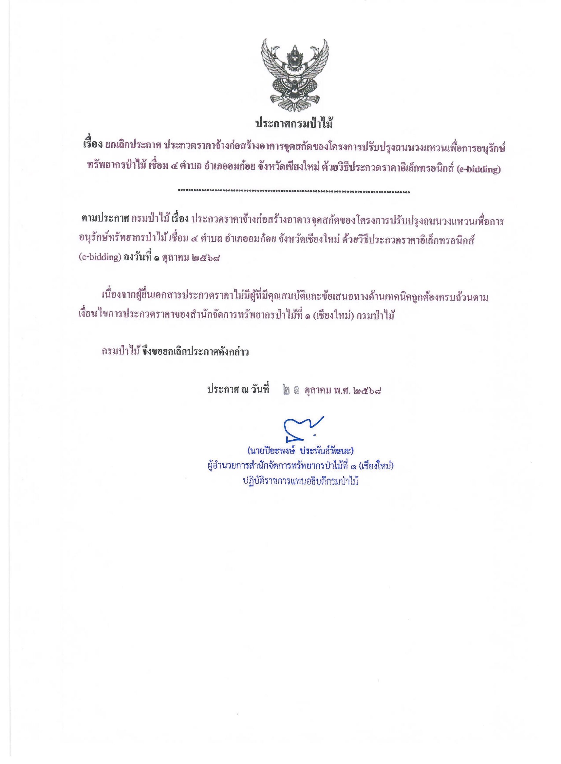 ประกาศกรมป่าไม้ เรื่อง ยกเลิกประกาศ ประกวดราคาจ้างก่อสร้างอาคารจุดกัดของโครงการปรับปรุงถนนวงแหวนเพื่อการอนุรักษ์ทรัพยากรป่าไม้ เชื่อม ๔ ตำบล อำเภออมก๋อย จังหวัดเชียงใหม่ ด้วยวิธีประกวดราคาอิเล็กทรอนิกส์ (e-bidding)