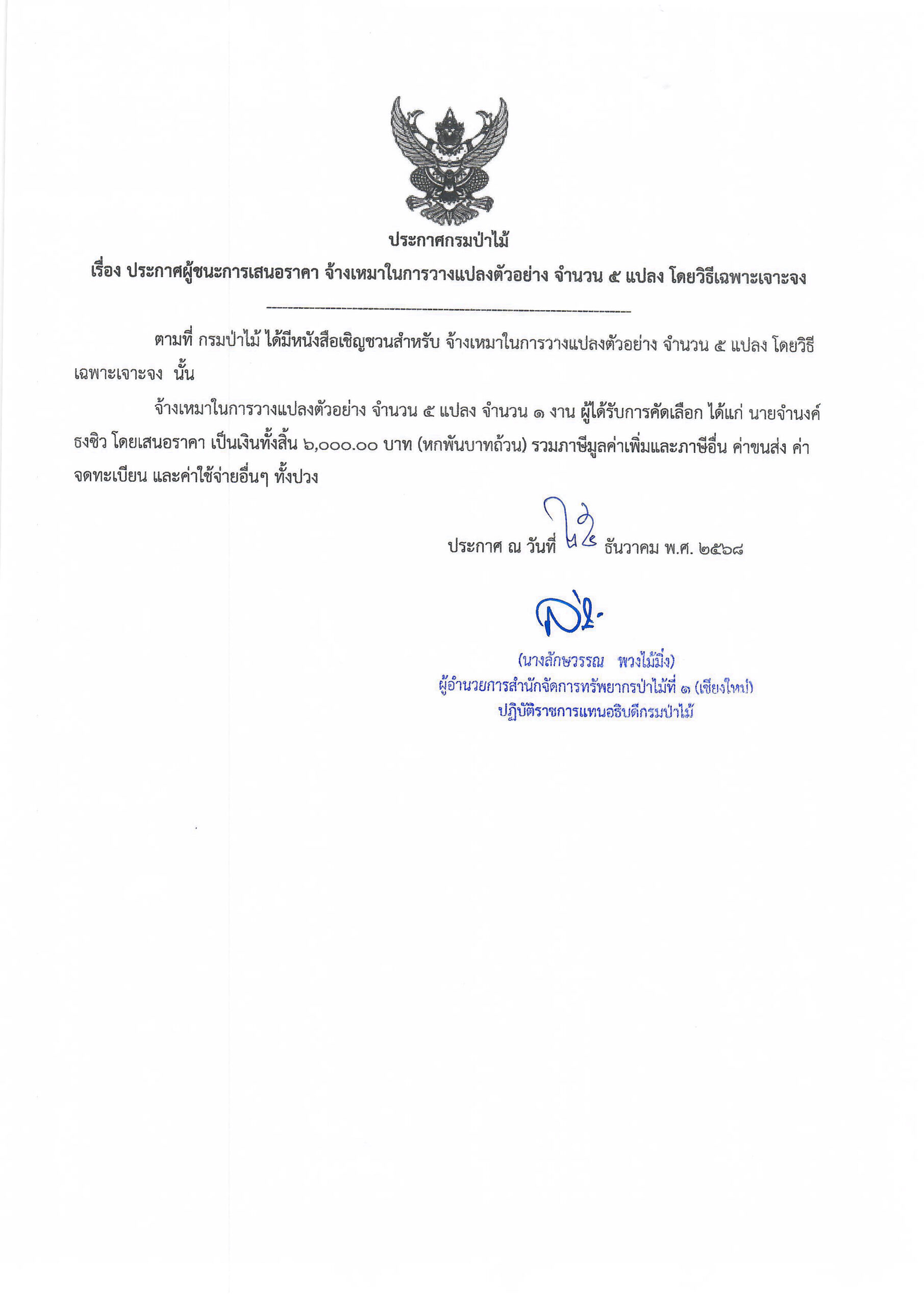 ประกาศกรมป่าไม้ เรื่อง ประกาศผู้ชนะการเสนอราคา จ้างเหมาในการวางแปลงตัวอย่าง จำนวน ๕ แปลง โดยวิธีเฉพาะเจาะจง25 ธันวาคม 2025 ใน ประกาศจัดซื้อจัดจ้าง / ประกาศผู้ชนะการเสนอราคา by adminir