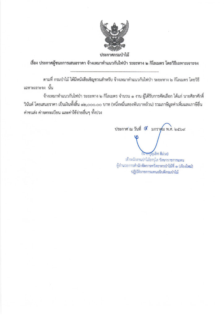 ประกาศกรมป่าไม้ เรื่อง ประกาศผู้ชนะเสนอราคา จ้างเหมาทำแนวกันไฟป่า ระยะทาง ๒ กิโลเมตร โดยวิธีเฉพาะเจาะจง8 มกราคม 2026 ใน ประกาศจัดซื้อจัดจ้าง / ประกาศผู้ชนะการเสนอราคา by adminir