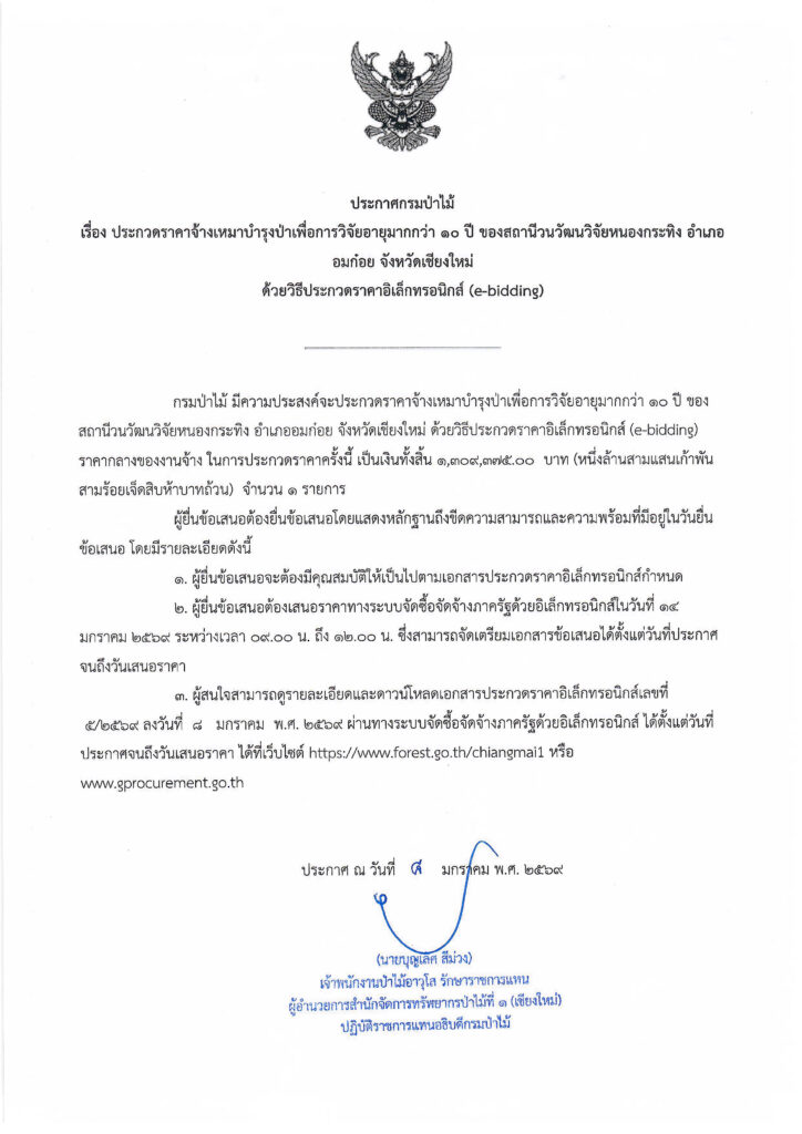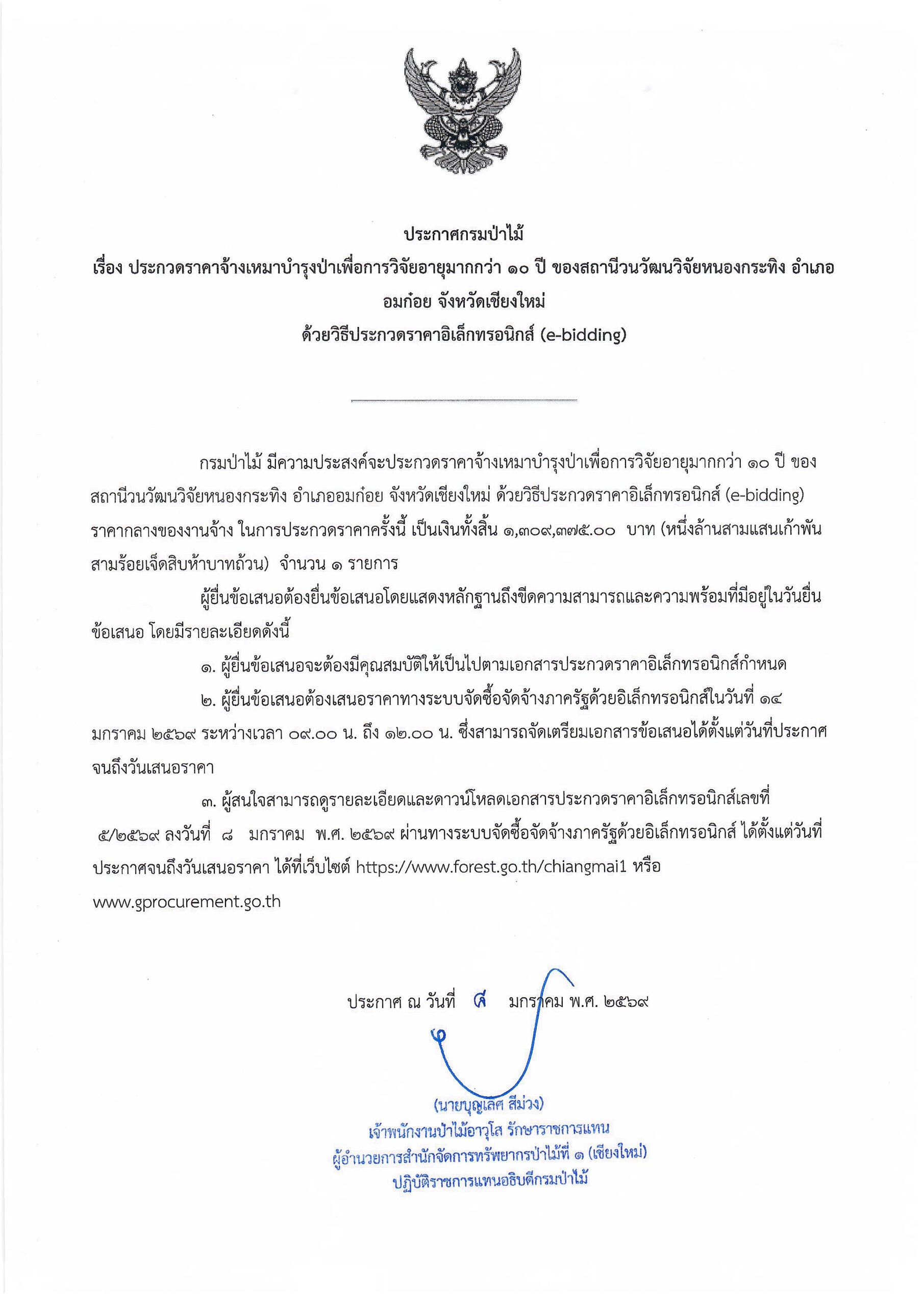 ประกาศกรมป่าไม้ เรื่อง ประกวดราคาจ้างเหมาบำรุงป่าเพื่อการวิจัยอายุมากกว่า ๑๐ ปี ของสถานีวนวัฒวิจัยหนองกระทิง อำเภออมก๋อย จังหวัดเชียงใหม่ ด้วยวิธีประกวดราคาอิเล็กทรอนิกส์ (e-bidding)8 มกราคม 2026 ใน ประกวดราคาจ้าง / ประกาศจัดซื้อจัดจ้าง by adminir