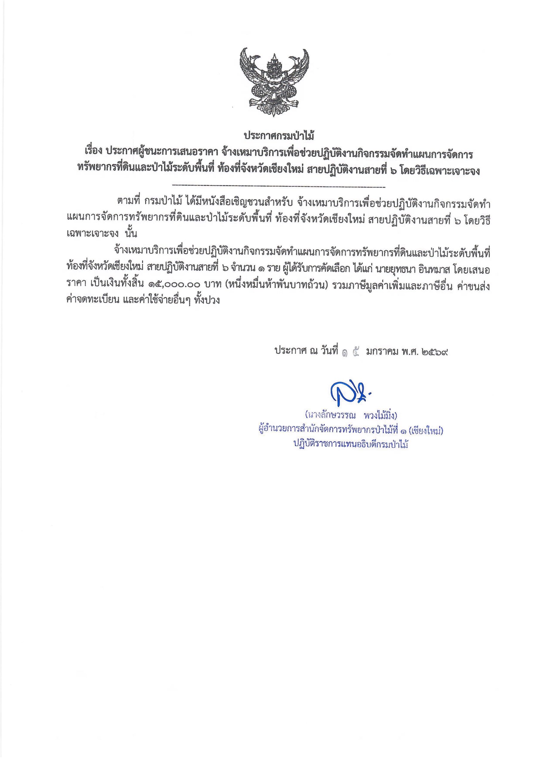 ประกาศกรมป่าไม้ เรื่อง ประกาศผู้ชนะการเสนอราคา จ้างเหมาบริการเพื่อช่วยปฏิบัติงานกิจกรรมจัดทำแผนการจัดการที่ดินและป่าไม้ระดับพื้นที่ ท้องที่จังหวัดเชียงใหม่ สายปฏิบัติงานสายที่ ๖ โดยวิธีเฉพาะเจาะจง15 มกราคม 2026 ใน ประกาศจัดซื้อจัดจ้าง / ประกาศผู้ชนะการเสนอราคา by adminir