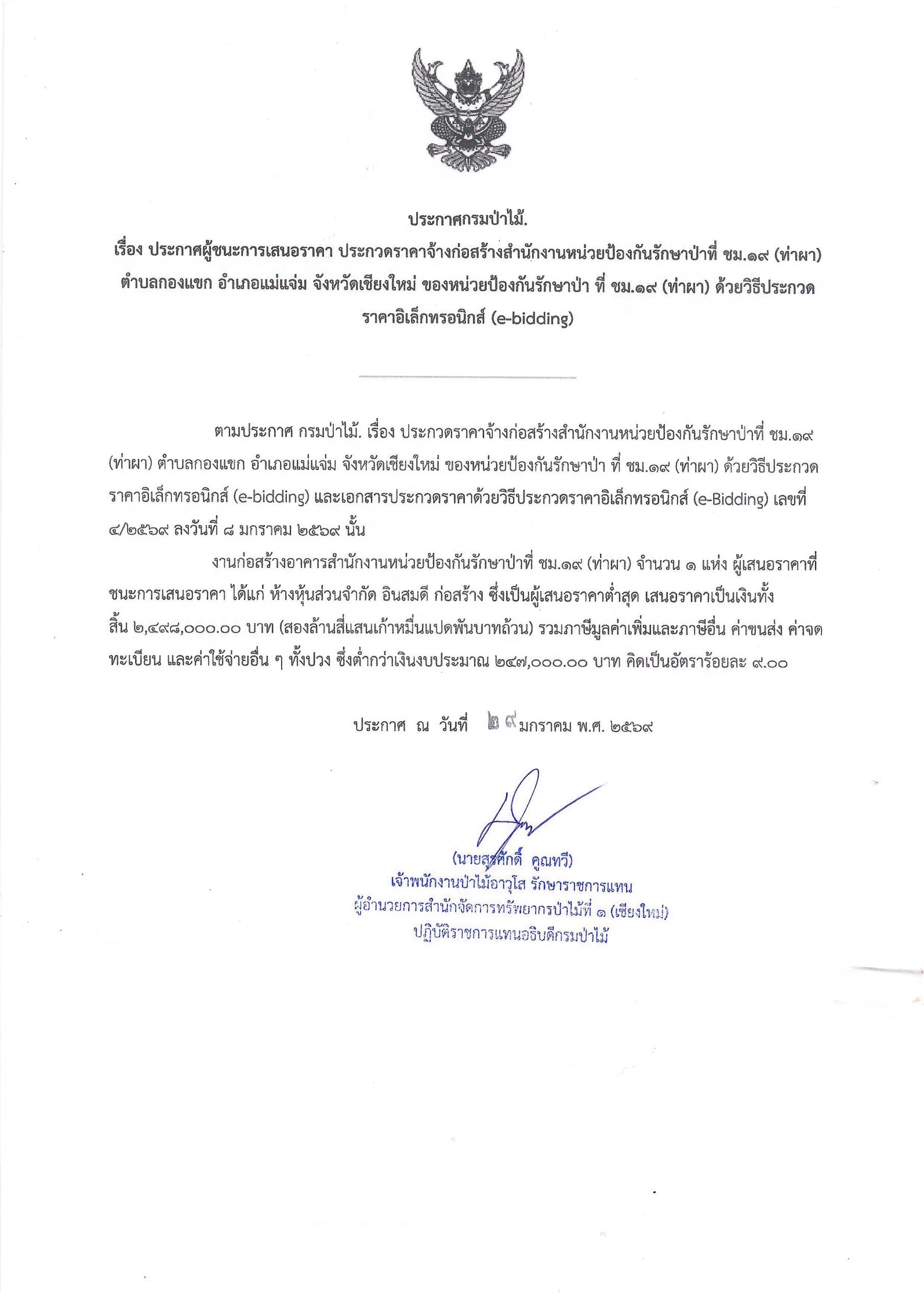 ประกาศกรมป่าไม้ เรื่อง ประกาศผู้ชนะการเสนอราคา ประกวดราคาจ้างก่อสร้างสำนักงานหน่วยป้องกันรักษาป่าที่ ชม.๑๙ (ท่าผา) ตำบลกองแขก อำเภอแม่แจ่ม จังหวัดเชียงใหม่ ของหน่วยป้องกันรักษาป่า ที่ ชม.๑๙ (ท่าผา) ด้วยวิธีประกวดราคาอิเล็กทรอนิกส์ (e-bidding)29 มกราคม 2026 ใน ประกาศจัดซื้อจัดจ้าง / ประกาศผู้ชนะการเสนอราคา by adminir