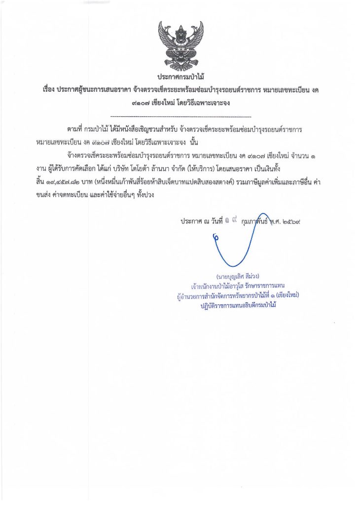 ประกาศกรมป่าไม้ เรื่อง ประกาศผู้ชนะการเสนอราคา จ้างตรวจเช็คระยะพร้อมซ่อมบำรุงรถยนต์ราชการ หมายเลขทะเบียน งด ๙๑๐๗ เชียงใหม่ โดยวิธีเฉพาะเจาะจง