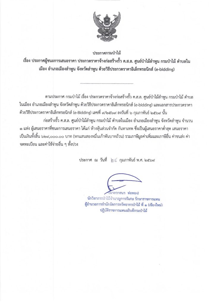 ประกาศกรมป่าไม้ เรื่อง ประกาศผู้ชนะการเสนอราคา ประกวดราคาจ้างก่อสร้างรั้ว ค.ส.ล. ศูนย์ป่าไม้ลำพูน กรมป่าไม้ ตำบลในเมือง อำเภอเมืองลำพูน จังหวัดลำพูน ด้วยวิธีประกวดราคาอิเล็กทรอนิกส์ (e-bidding)