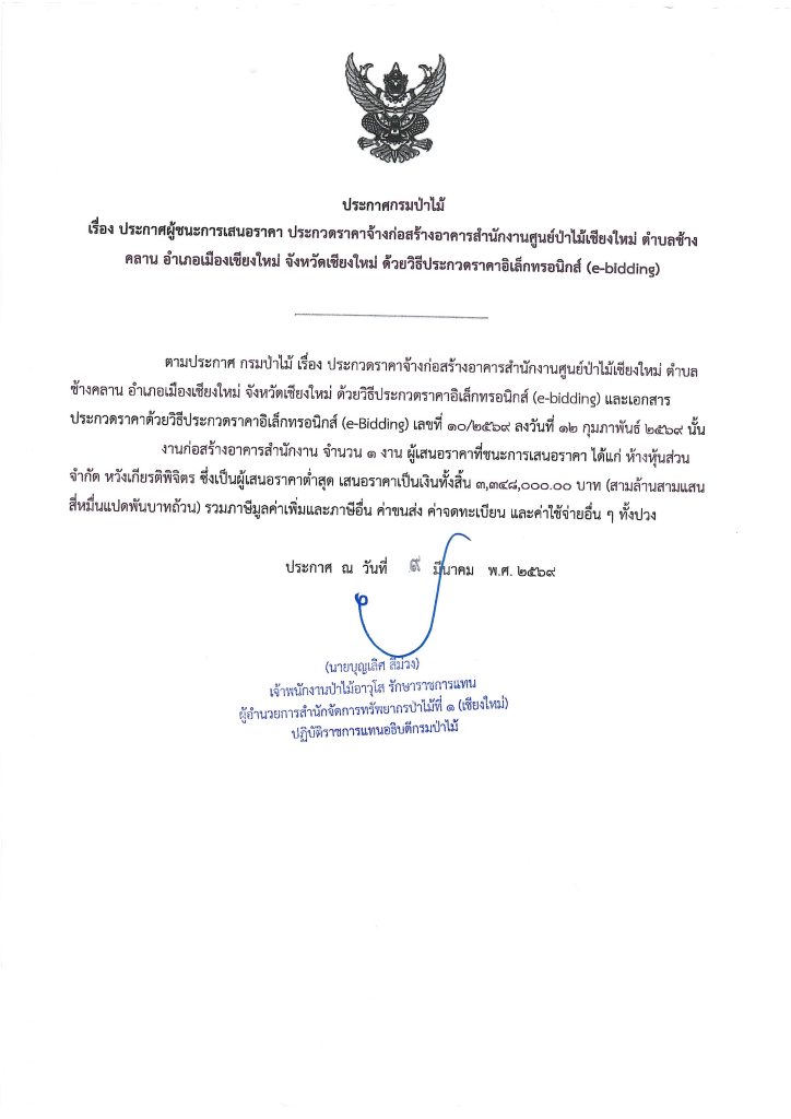 ประกาศกรมป่าไม้ เรื่อง ประกาศผู้ชนะการเสนอราคา ประกวดราคาจ้างก่อสร้างอาคารสำนักงานศูนย์ป่าไม้เชียงใหม่ ตำบลช้าง คลาน อำเภอเมืองเชียงใหม่ จังหวัดเชียงใหม่ ด้วยวิธีประกวดราคาอิเล็กทรอนิกส์ (e-bidding)