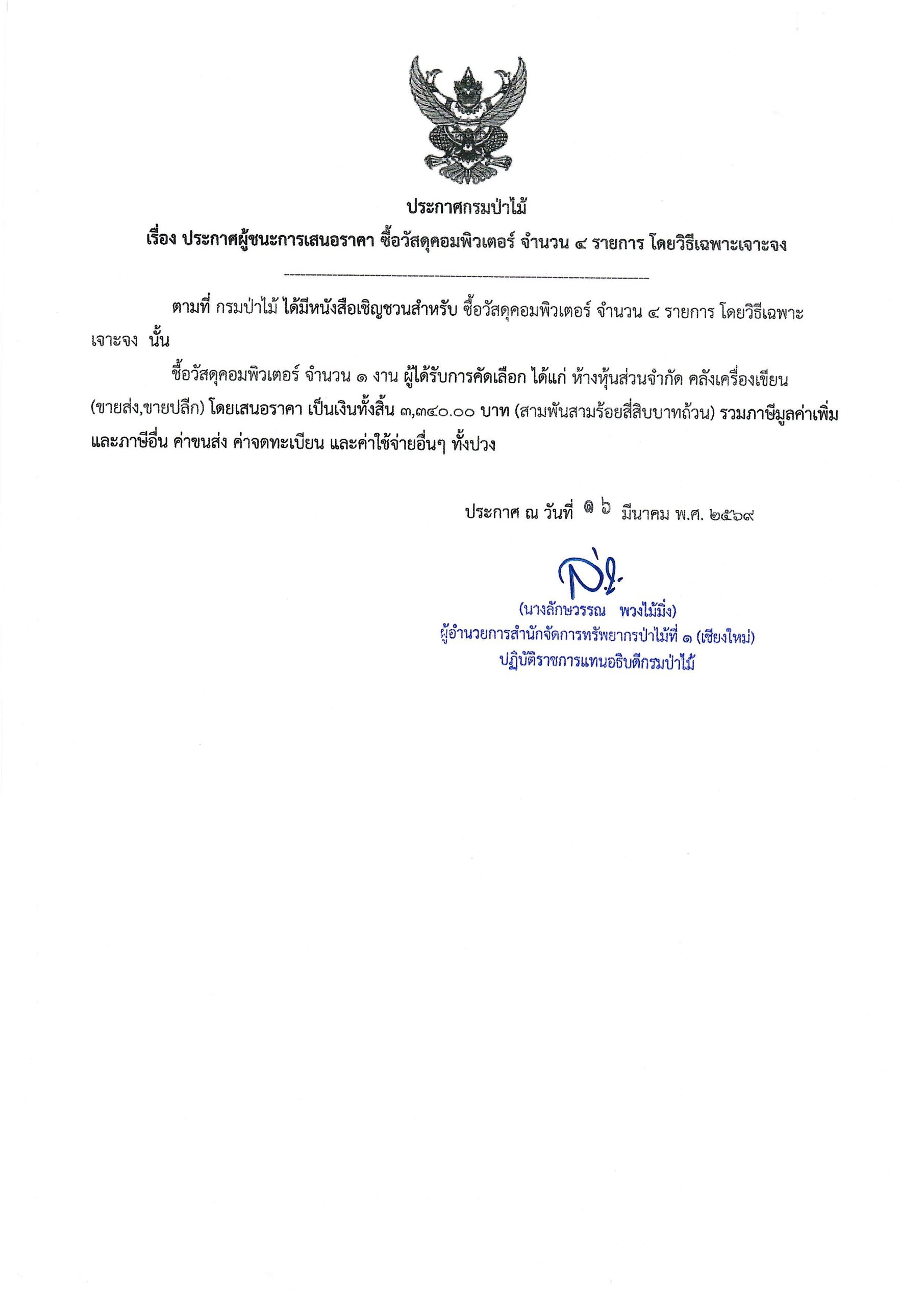 ประกาศกรมป่าไม้ เรื่อง ประกาศผู้ชนะการเสนอราคา ซื้อวัสดุคอมพิวเตอร์ จำนวน ๔ รายการ โดยวิธีเฉพาะเจาะจง17 มีนาคม 2026 ใน ประกาศจัดซื้อจัดจ้าง / ประกาศผู้ชนะการเสนอราคา by adminir