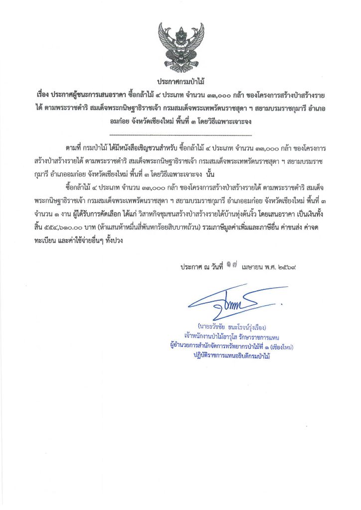 ประกาศกรมป่าไม้ เรื่อง ประกาศผู้ชนะการเสนอราคา ซื้อกล้าไม้ ๔ ประเภท จำนวน ๓๓,๐๐๐ กล้า ของโครงการสร้างป่าสร้างรายได้ ตามพระราชดำริ สมเด็จพระกนิษฐาธิราชเจ้า กรมสมเด็จพระเทพรัตนราชสุดา ฯ สยามบรมราชกุมารี อำเภออมก๋อย จังหวัดเชียงใหม่ พื้นที่ ๓ โดยวิธีเฉพาะเจาะจง