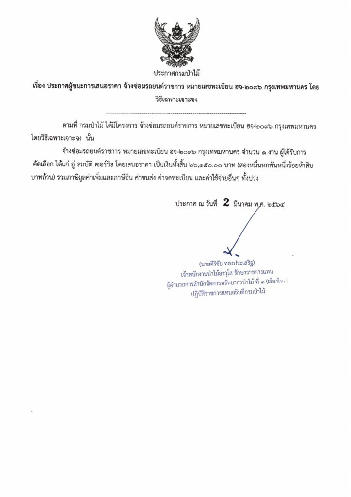 ประกาศกรมป่าไม้ เรื่อง ประกาศผู้ชนะการเสนอราคา จ้างซ่อมรถยนต์ราชการ หมายเลขทะเบียน ฮจ-2096 กรุงเทพมหานคร โดยวิธีเฉพาะเจาะจง