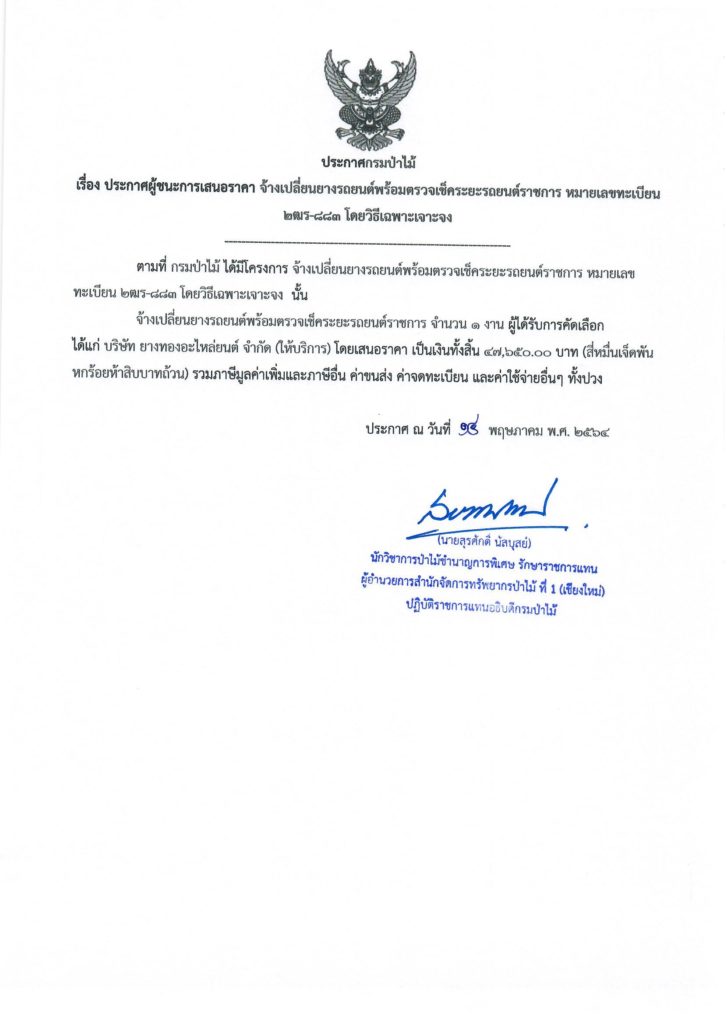 ประกาศกรมป่าไม้ เรื่อง ประกาศผู้ชนะการเสนอราคา จ้างเปลี่ยนยางรถยนด์พร้อมตรวจเช็คระยะรถยนต์ราชการ หมายเลขทะเบียน 2ฒร-883โดยวิธีเฉพาะเจาะจง14 พฤษภาคม 2021 ใน ประกาศ by adminir