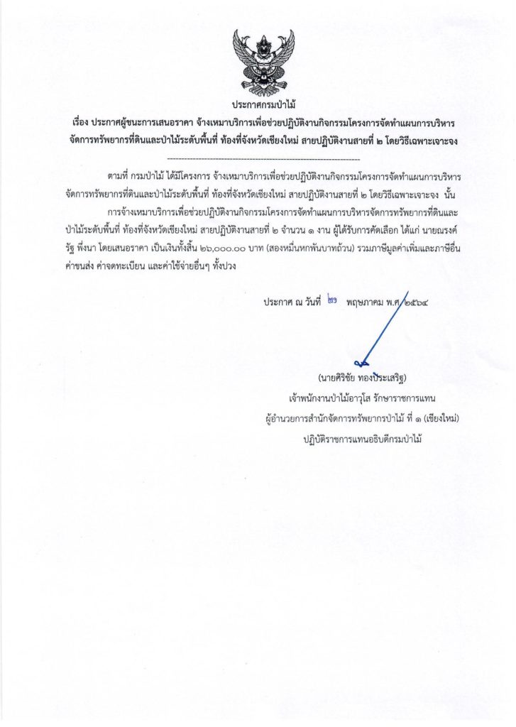 ประกาศกรมป่าไม้ เรื่อง ประกาศผู้ชนะการเสนอราคา จ้างเหมาบริการเพื่อช่วยปฏิบัติงานกิจกรรมโครงการจัดทำแผนการบริหารจัดการทรัพยากรที่ดินและป่าไม้ระดับพื้นที่ ท้องที่จังหวัดเชียงใหม่ สายปฏิบัติงานสายที่ 2 โดยวิธีเฉพาะเจาะจง