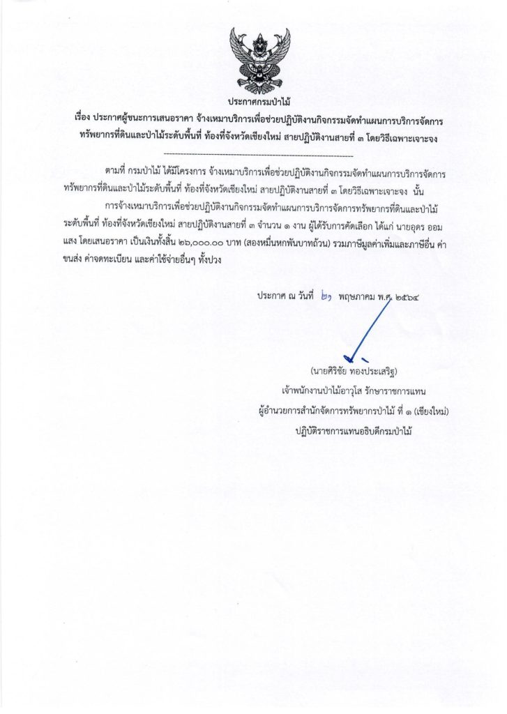 ประกาศกรมป่าไม้ เรื่อง ประกาศผู้ชนะการเสนอราคา จ้างเหมาบริการเพื่อช่วยปฏิบัติงานกิจกรรมโครงการจัดทำแผนการบริหารจัดการทรัพยากรที่ดินและป่าไม้ระดับพื้นที่ ท้องที่จังหวัดเชียงใหม่ สายปฏิบัติงานสายที่ 3 โดยวิธีเฉพาะเจาะจง