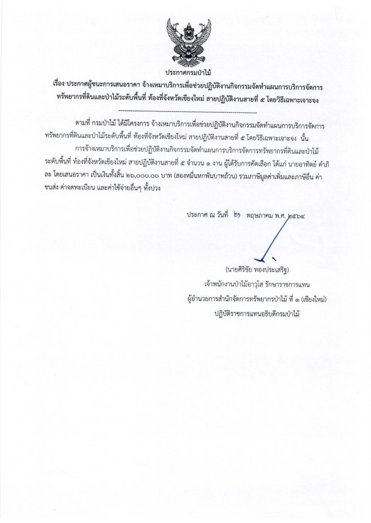 ประกาศกรมป่าไม้ เรื่อง ประกาศผู้ชนะการเสนอราคา จ้างเหมาบริการเพื่อช่วยปฏิบัติงานกิจกรรมโครงการจัดทำแผนการบริหารจัดการทรัพยากรที่ดินและป่าไม้ระดับพื้นที่ ท้องที่จังหวัดเชียงใหม่ สายปฏิบัติงานสายที่ 5 โดยวิธีเฉพาะเจาะจง25 พฤษภาคม 2021 ใน ประกาศ by adminir