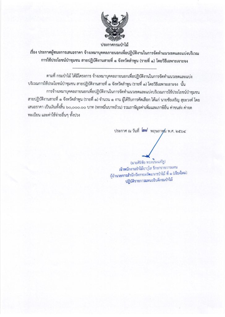 ประกาศกรมป่าไม้ เรื่อง ประกาศผู้ชนะการเสนอราคา จ้างเหมาบุคคลภายนอกเพื่อปฏิบัติงานในการจัดทำแนวเขตและแบ่งบริเวณการใช้ประโยชน์ป่าชุมชน สายปฏิบัติงานสายที่ 1 จังหวัดลำพูน (รายที่ 1) โดยวิธีเฉพาะเจาะจง