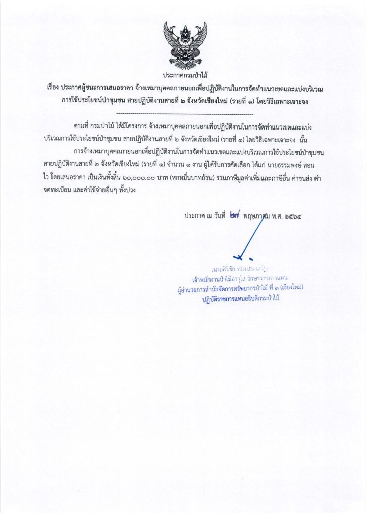 ประกาศกรมป่าไม้ เรื่อง ประกาศผู้ชนะการเสนอราคา จ้างเหมาบุคคลภายนอกเพื่อปฏิบัติงนในการจัดทำแนวเขตและแบ่งบริเวณการใช้ประโยชน์ป่าชุมชน สายปฏิบัติงานสายที่ 2 จังหวัดเชียงใหม่ (รายที่ 1) โดยวิธีเฉพาะเจาะจง27 พฤษภาคม 2021 ใน ประกาศ by adminir