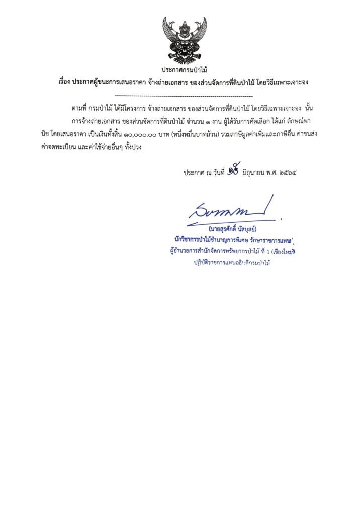 ประกาศกรมป่าไม้ เรื่อง ประกาศผู้ชนะการเสนอราคา จ้างถ่ายเอกสาร ของส่วนจัดการที่ดินป่าไม้ โดยวิธีเฉพาะเจาะจง15 มิถุนายน 2021 ใน ประกาศ by adminir