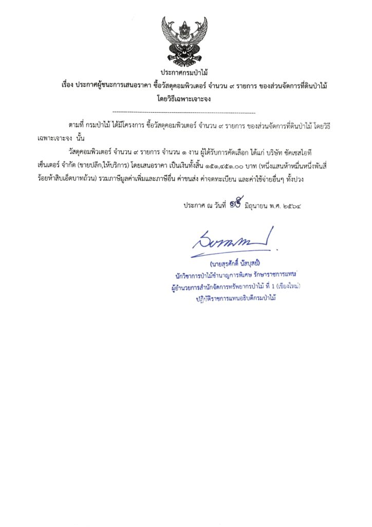 ประกาศกรมป่าไม้ เรื่อง ประกาศผู้ชนะการเสนอราคา ซื้อวัสดุคอมพิวเตอร์ จำนวน ๙ รายการ ของส่วนจัดการที่ดินป่าไม้ โดยวิธีเฉพาะเจาะจง15 มิถุนายน 2021 ใน ประกาศ by adminir