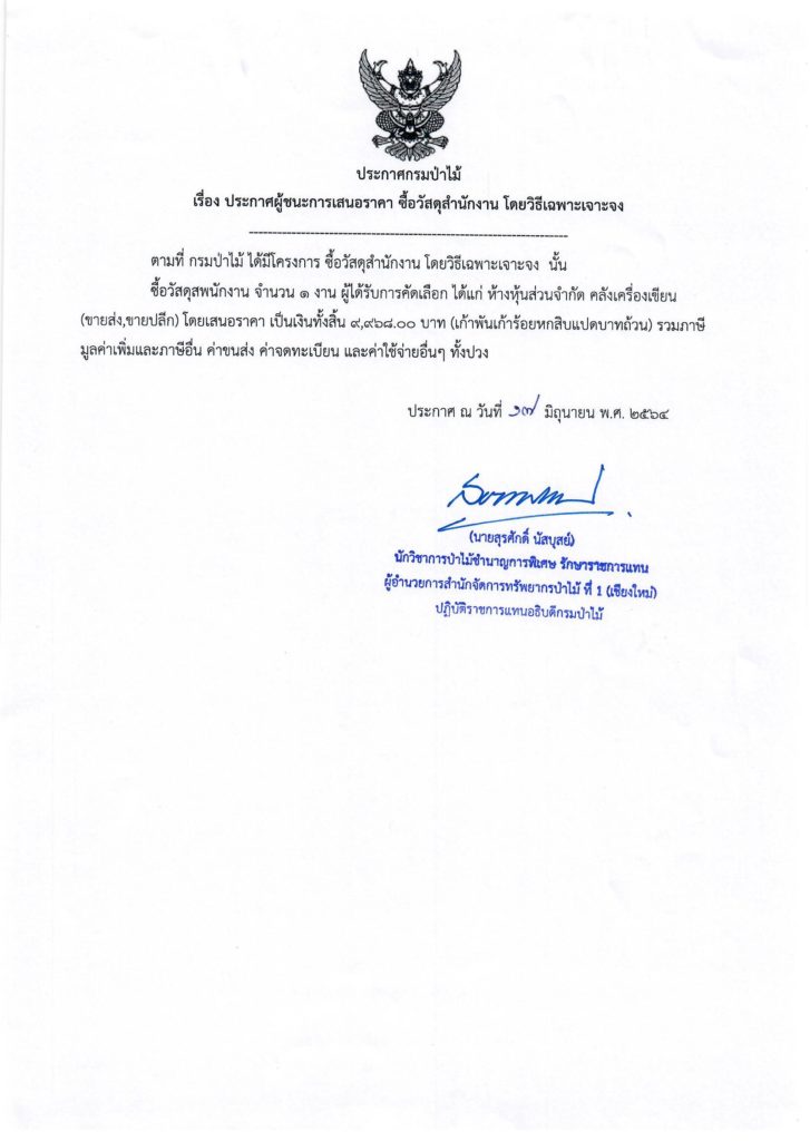 ประกาศกรมป่าไม้ เรื่อง ประกาศผู้ชนะการเสนอราคา ซื้อวัสดุสำนักงาน โดยวิธีเฉพาะเจาะจง