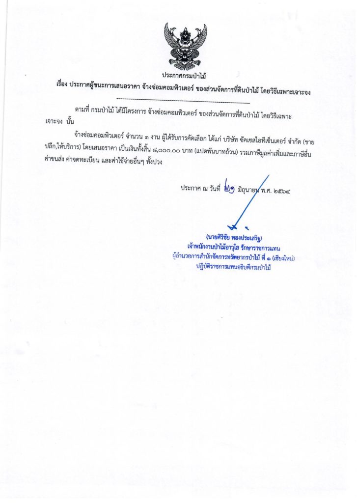ประกาศกรมป่าไม้ เรื่อง ประกาศผู้ชนะการเสนอราคา จ้างซ่อมคอมพิวเตอร์ ของส่วนจัดการที่ดินป่าไม้ โดยวิธีเฉพาะเจาะจง