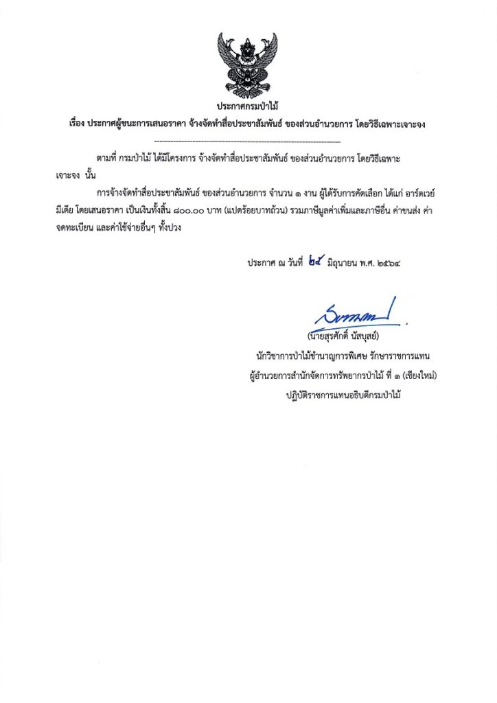 ประกาศกรมป่าไม้ เรื่อง ประกาศผู้ชนะการเสนอราคา จ้างจัดทำสื่อประชาสัมพันธ์ ของส่วนอำนวยการ โดยวิธีเฉพาะเจาะจง25 มิถุนายน 2021 ใน ประกาศ by adminir