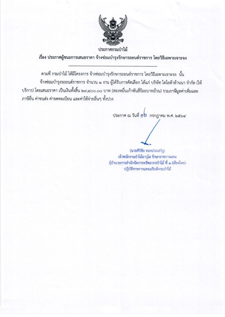 ประกาศกรมป่าไม้ เรื่อง ประกาศผู้ชนะการเสนอราคา จ้างซ่อมบำรุงรักษารถยนต์ราชการ โดยวิธีเฉพาะเจาะจง12 กรกฎาคม 2021 ใน ประกาศ by adminir
