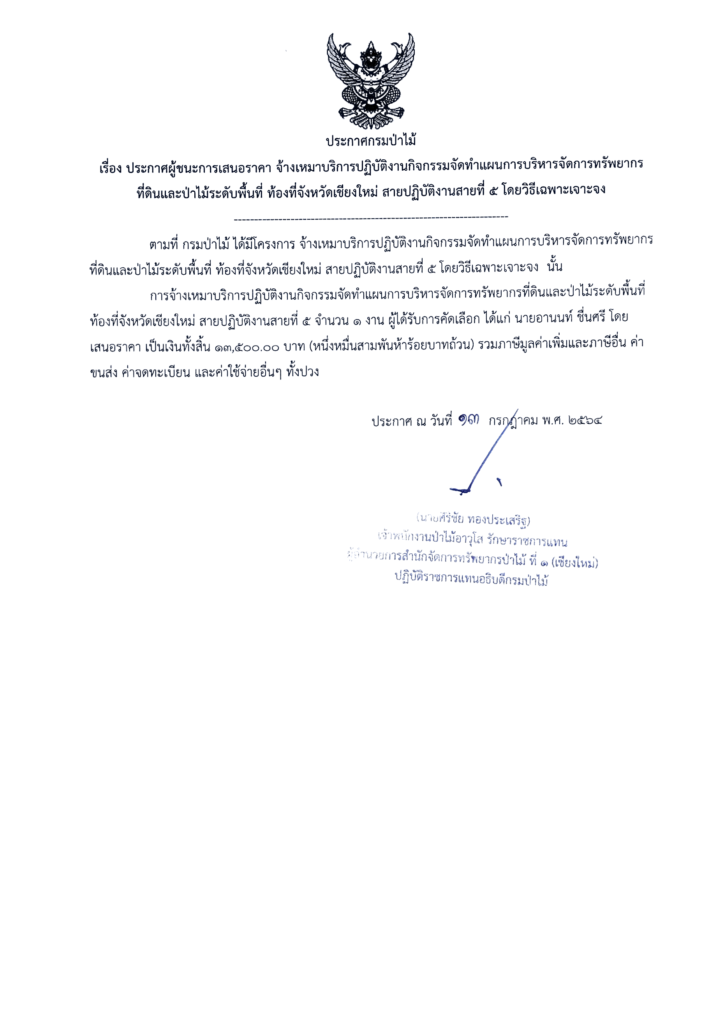 ประกาศกรมป่าไม้ เรื่อง ประกาศผู้ชนะการเสนอราคา จ้างเหมาบริการปฏิบัติงานกิจกรรมจัดทำแผนการบริหารจัดการทรัพยากรที่ดินและป่าไม้ระดับพื้นที่ ท้องที่จังหวัดเชียงใหม่ สายปฏิบัติงานสายที่ ๕ โดยวิธีเฉพาะเจาะจง13 กรกฎาคม 2021 ใน ประกาศ by adminir