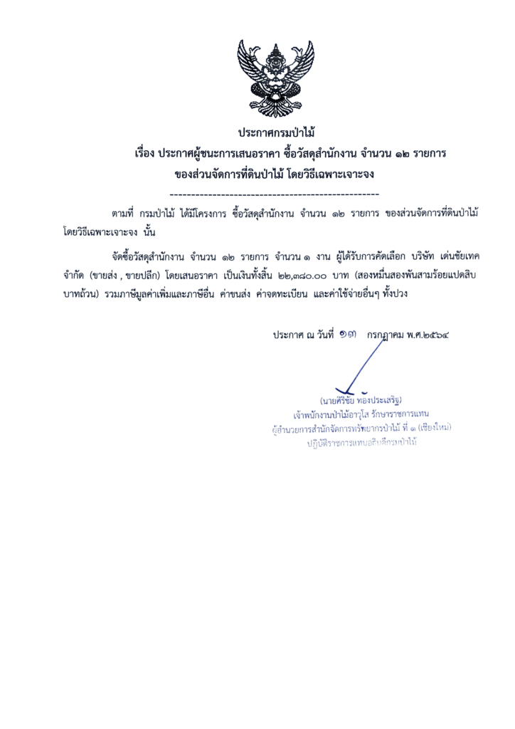 ประกาศกรมป่าไม้ เรื่อง ประกาศผู้ชนะการเสนอราคา ซื้อวัสดุสำนักงาน จำนวน ๑๒ รายการ ของส่วนจัดการที่ดินป่าไม้ โดยวิธีเฉพาะเจาะจง13 กรกฎาคม 2021 ใน ประกาศ by adminir