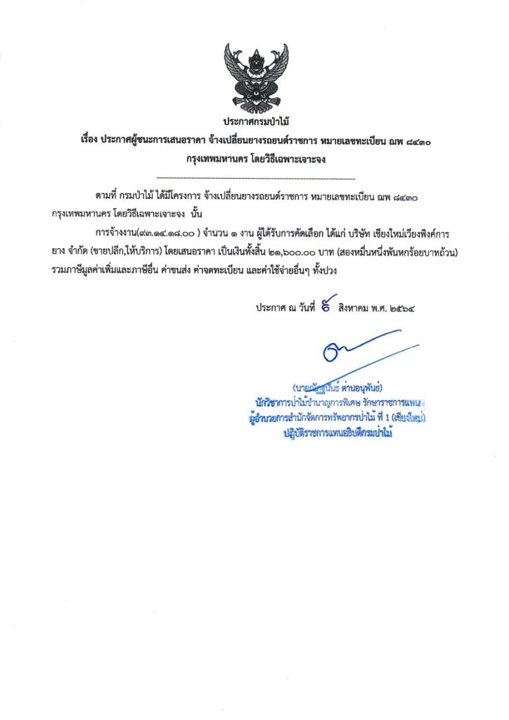 ประกาศกรมป่าไม้ เรื่อง ประกาศผู้ชนะการเสนอราคา จ้างเปลี่ยนยางรถยนต์ราซการ หมายเลขทะเบียน ฌพ 8730 กรุงเทพมหานคร โดยวิธีเฉพาะเจาะจง9 สิงหาคม 2021 ใน ประกาศ by adminir