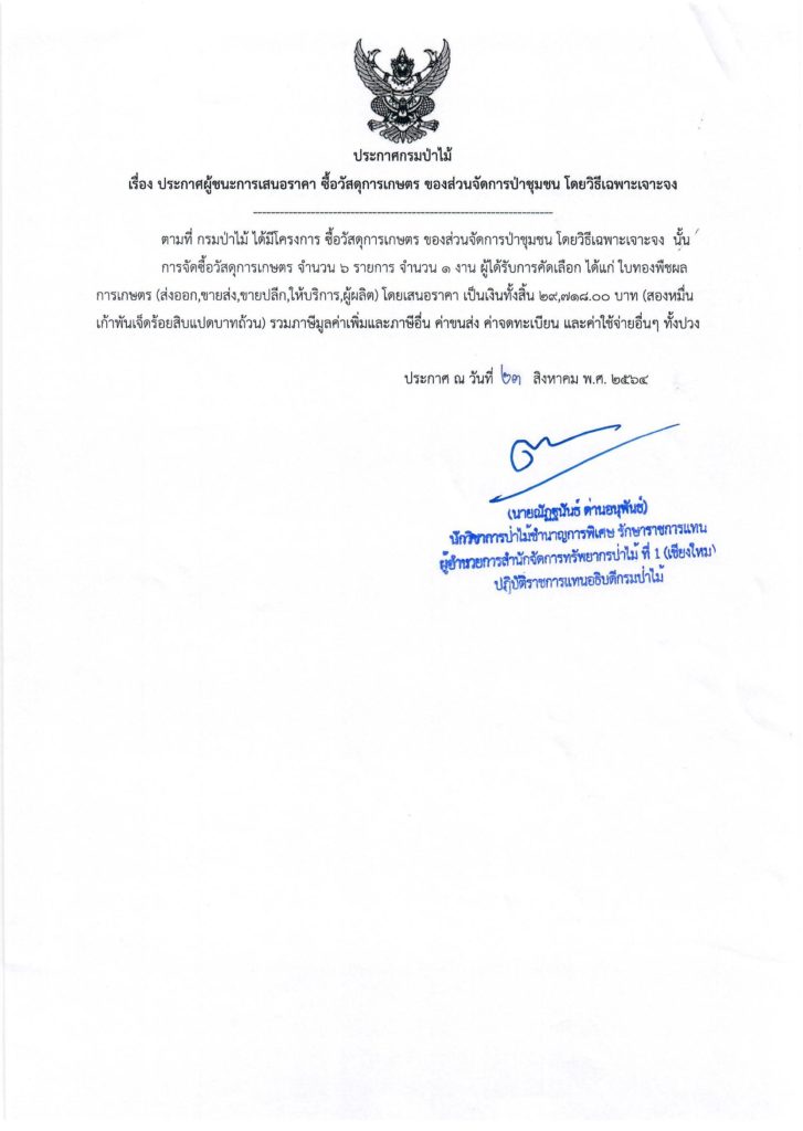 ประกาศกรมป่าไม้ เรื่อง ประกาศผู้ขนะการเสนอราคา ซื้อวัสดุการเกษตร ของส่วนจัดการป่าชุมชน โดยวิธีเฉพาะเจาะจง23 สิงหาคม 2021 ใน ประกาศ by adminir