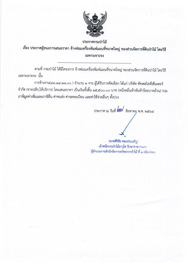 ประกาศกรมป่าไม้ เรื่อง ประกาศผู้ชนะการเสนอราคา จ้างซ่อมเครื่องพิมพ์แผนที่ขนาดใหญ่ ของส่วนจัดการที่ดินป่าไม้ โดยวิธีเฉพาะเจาะจง27 สิงหาคม 2021 ใน ประกาศ by adminir