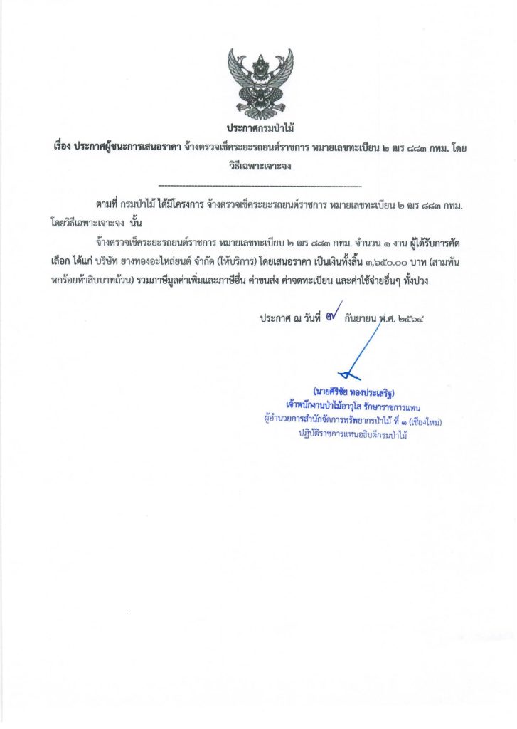 ประกาศกรมป่าไม้ เรื่อง ประกาศผู้ชนะการเสนอราคา จ้างตรวจเช็คระยะรถยนต์ราชการ หมายเลขทะเบียน ๒ ตร ๘๘๓ กทม. โดยวิธีเฉพาะเจาะจง7 กันยายน 2021 ใน ประกาศ by adminir