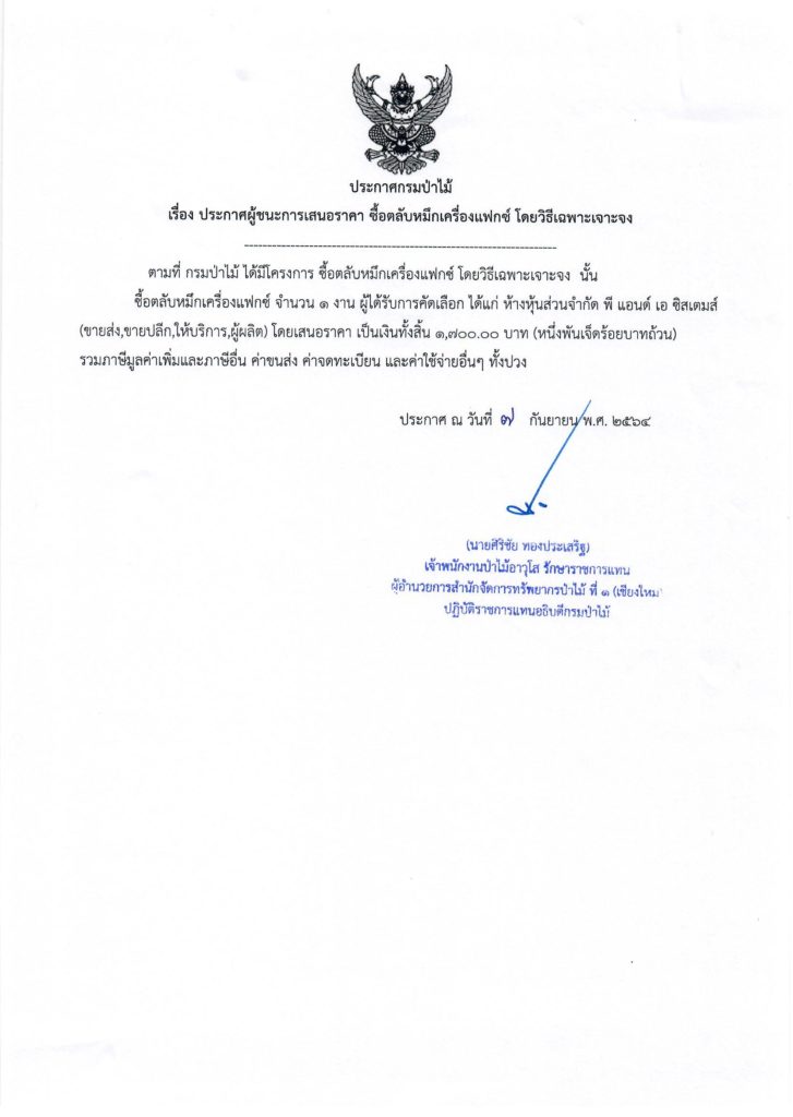 ประกาศกรมป่าไม้ เรื่อง ประกาศผู้ชนะการเสนอราคา ซื้อตลับหมึกเครื่องแฟกซ์ โดยวิธีเฉพาะเจาะจง7 กันยายน 2021 ใน ประกาศ by adminir