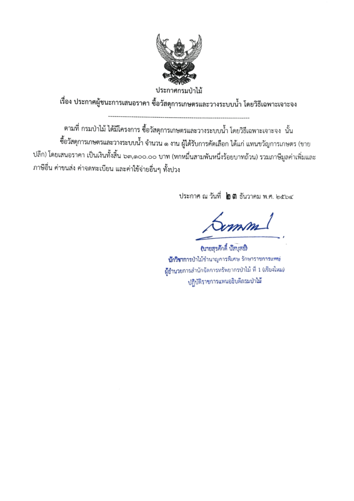 ประกาศกรมป่าไม้ เรื่อง ประกาศผู้ชนะการเสนอราคา ซื้อวัสดุการเกษตรและวางระบบน้ำ โดยวิธีเฉพาะเจาะจง23 ธันวาคม 2021 ใน ประกาศ by adminir