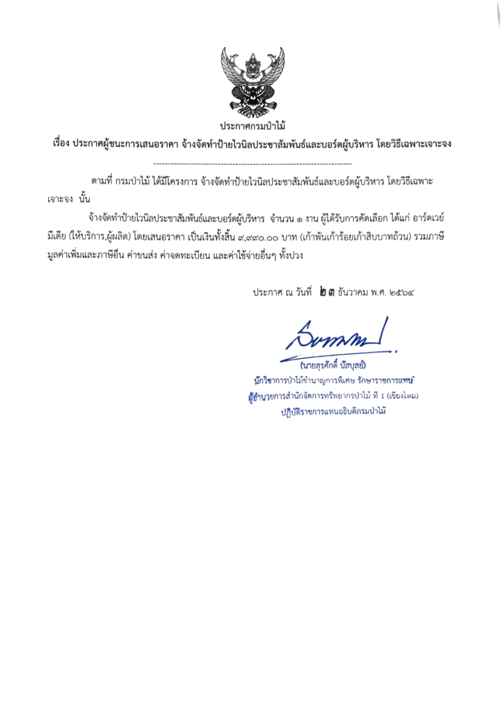 ประกาศกรมป่าไม้ เรื่อง ประกาศผู้ชนะการเสนอราคา จ้างจัดทำป้ายไวนิลประชาสัมพันธ์และบอร์ดผู้บริหาร โดยวิธีเฉพาะเจาะจง23 ธันวาคม 2021 ใน ประกาศ by adminir
