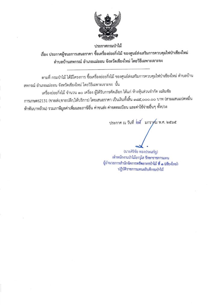 ประกาศกรมป่าไม้ เรื่อง ประกาศผู้ชนะการเสนอราคา ซื้อเครื่องย่อยกิ่งไม้ ของศูนย์ส่งเสริมการควบคุมไฟป่าเชียงใหม่ ตำบลบ้านสหกรณ์ อำเภอแม่ออน จังหวัดเชียงใหม่ โดยวิธีเฉพาะเจาะจง27 มกราคม 2022 ใน ประกาศ by adminir