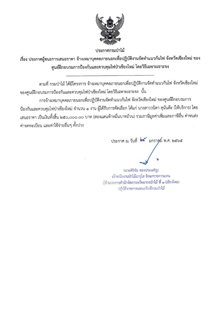 ประกาศกรมป่าไม้ เรื่อง ประกาศผู้ชนะการเสนอราคา จ้างเหมาบุคคลภายนอกเพื่อปฏิบัติงานจัดทำแนวกันไฟ จังหวัดเชียงใหม่ ของ ศูนย์ฝึกอบรมการป้องกันและควบคุมไฟป่าเชียงใหม่ โดยวิธีเฉพาะเจาะจง27 มกราคม 2022 ใน ประกาศ by adminir